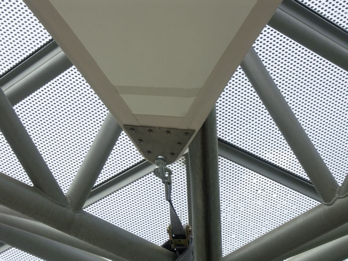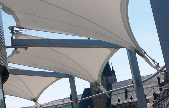 Panorama Seebühne Zeulenroda Gefertigt wurde das rund 1000 m² große Bühnen-Membrandach aus einem speziellen PVC Gewebe. Die einzelnen Flächen wurden mittels Hochfrequenzmaschinen verschweißt.